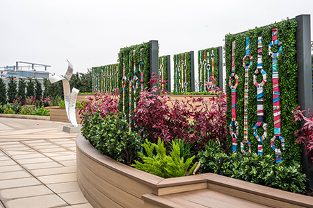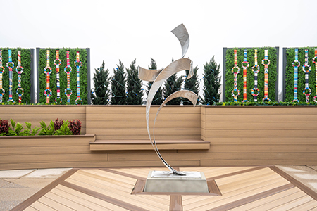 In addition to the greenwalls, the terrace has been enlivened with highly realistic faux plants and grasses native to the region with seasonal additions — including boxwoods, evergreen and cypress trees, maple bushes, ferns, eucalyptus and lavender. The layered landscaping and artistic additions warm up the space, emulating the feeling of a private garden.