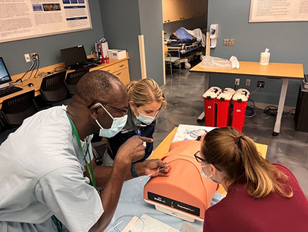 There are full-body, high-fidelity adult and pediatric mannequins for simulation scenarios, as well as specific trainers for procedures such as airway management, central lines, US guided peripheral IVs, lumbar puncture, paracentesis, chest thoracostomy and cricothyroidotomy.