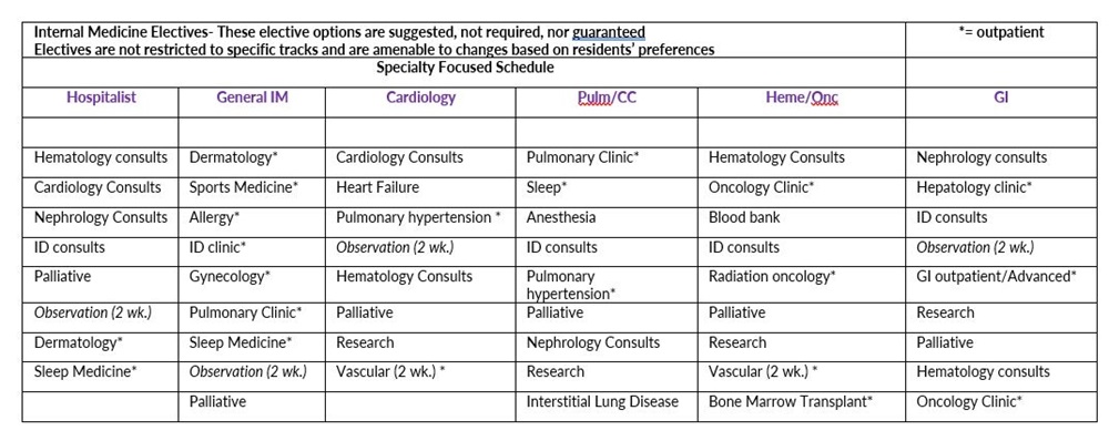 During your second and third year of residency, you can tailor your schedule to help meet your career goals. In addition, some electives are required, including rheumatology, endocrinology, general medicine consults, and a clinic block elective (Geriatrics, outreach, and ambulatory telemedicine).