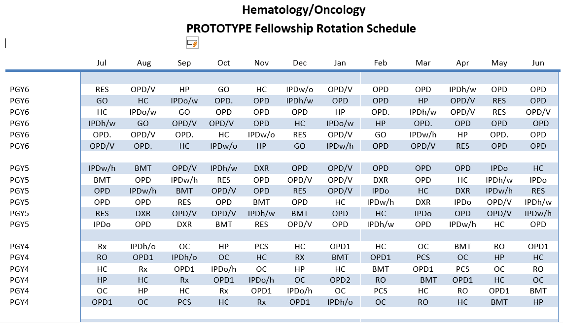 GO-Gyn Oncology, PCS-Palliative Care Service, HC-Hematology Consults, OC-Oncology Consults, RES-Research, HP-Pathology/Coag/BloodBank/Genetics, BMT -Bone Marrow Transplant, OPD1-Out Patient Rotation, RO- Radiation Oncology, OPD2 -Additional OPD Experience, Rx –Chemotherapy infusion room, IPD-inpatient oncology/hematology, DxR -Diagnostic Radiology, V-Vacation