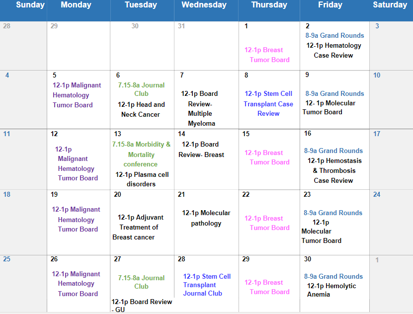 12-1PM from Mon to Fri is allotted time for noon conference. Content of noon lectures vary month to month. Attendance is encouraged and fellows working off site have the option of virtual attendance.