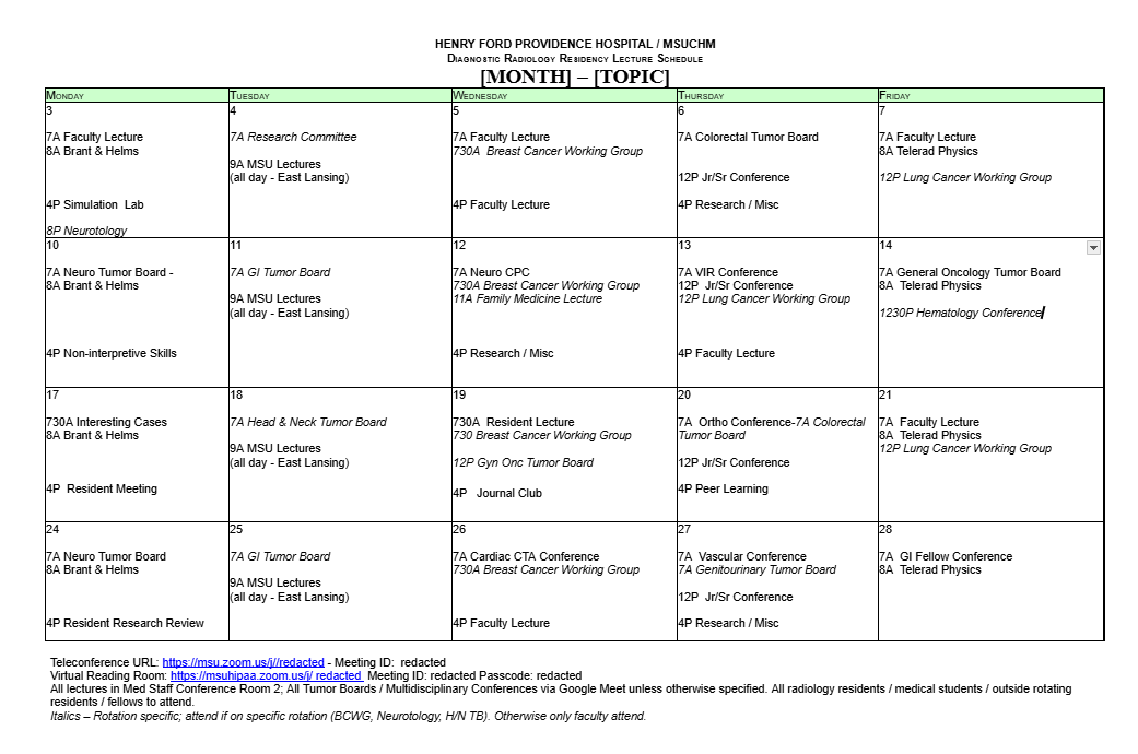 Residents participate in a weekly web conference presented by Dr. William Sensakovic of Telerad Physics (founded by Dr. Walter Huda). This interactive course offers comprehensive preparation for the Core examination. This curriculum serves in addition to radiologic physics didactic content at Providence and MSU.