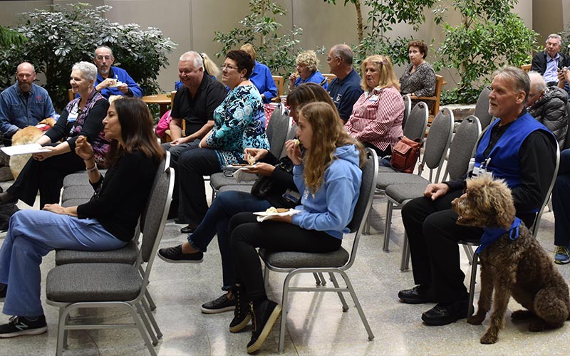 Our facility dogs include Bravo and Josie (Yellow Labradors); George, Buddy, Hank, Envy and Gilbert (Golden Retrievers); and Ace (a Goldendoodle and our first rescue). In addition, approximately 40 volunteer pet therapy teams visit patients, visitors, and employees as part of our furry team. Our dogs come in all shapes and sizes!
