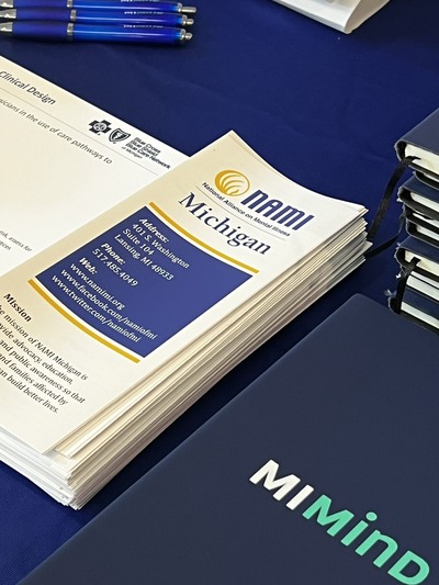 An assortment of MI Mind materials were handed out, including translated documents and NAMI Michigan brochures.