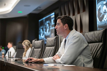 In addition to the imaging tests and biopsy options listed below, we’re also home to Michigan’s only comprehensive Interventional Pulmonology Program. Interventional pulmonology lets doctors diagnose and treat lung cancer without incisions using procedures performed with a bronchoscope, a thin, flexible tube with a light and a tiny video camera that lets us view the inside of your lungs. We’re also one of the first in the United States to use new robot-assisted bronchoscopy technology, which lets us more accurately diagnose small and hard-to-reach nodules in the lung.
