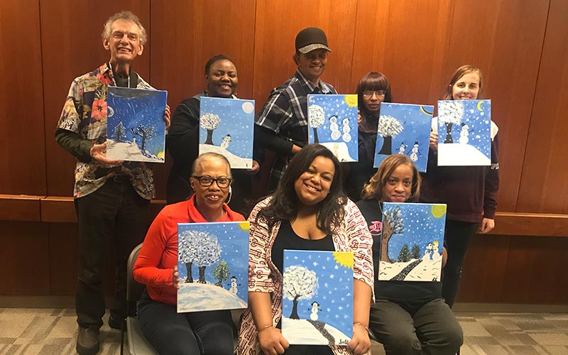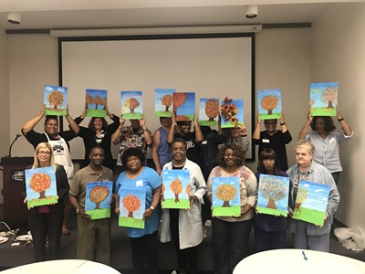 Beginning in 2018 PERC began to host quarterly Patient Advisor Social Events. These events give Patient Advisors a chance to have fun and mingle with individuals who participate in other Patient Advisor groups throughout the system. The social events are meant to bring people together and enjoy themselves. The pictures below were taken at our most popular social event “Painting with Patient Advisors”, a painting with a twist style event.